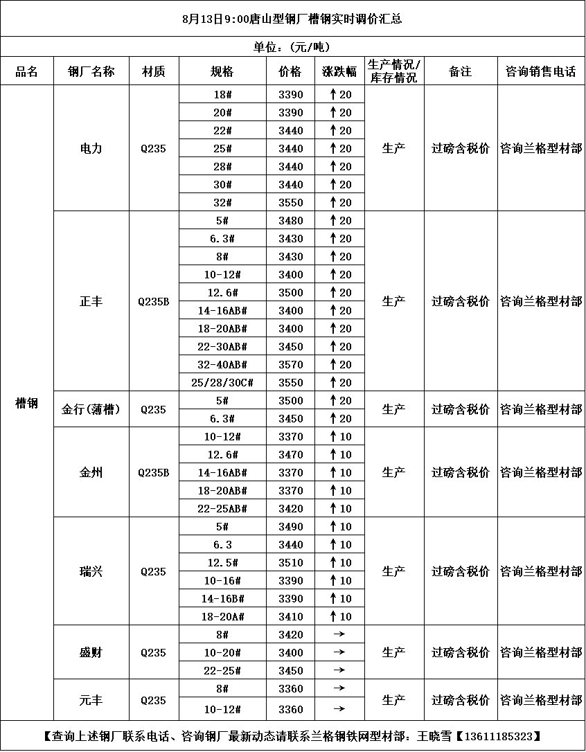 8月13日9:00唐山型钢厂槽钢实时调价汇总