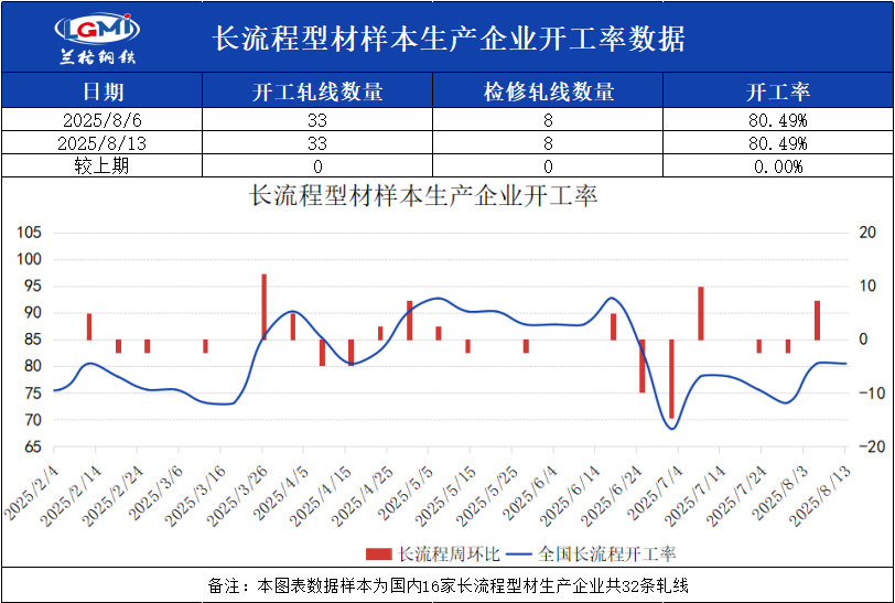截至8月13日16:00,兰格钢铁网统计国内21家长流程样本生产企业共41条型钢轧线,在产33条,停产8条,开工率为80.49%,较上周维持不变。