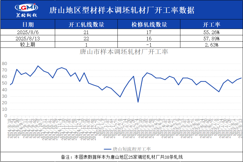 兰格钢铁网统计唐山24家样本轧钢企业共38条轧线,在产22条,停产16条,停产轧线数较上周减少1条,开工率为57.89%,较上周上升2.63%。