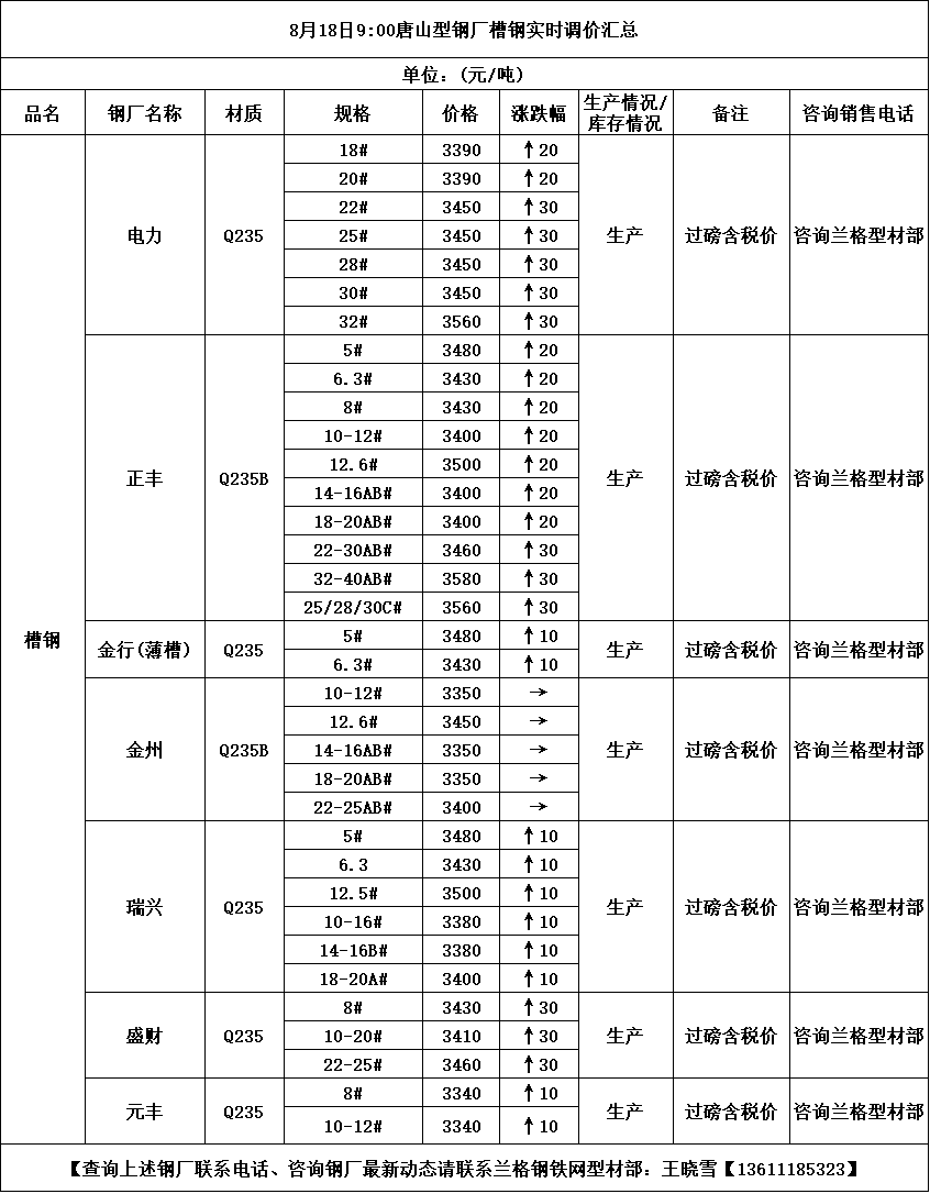 • 8月18日9:00唐山型钢厂槽钢实时调价汇总