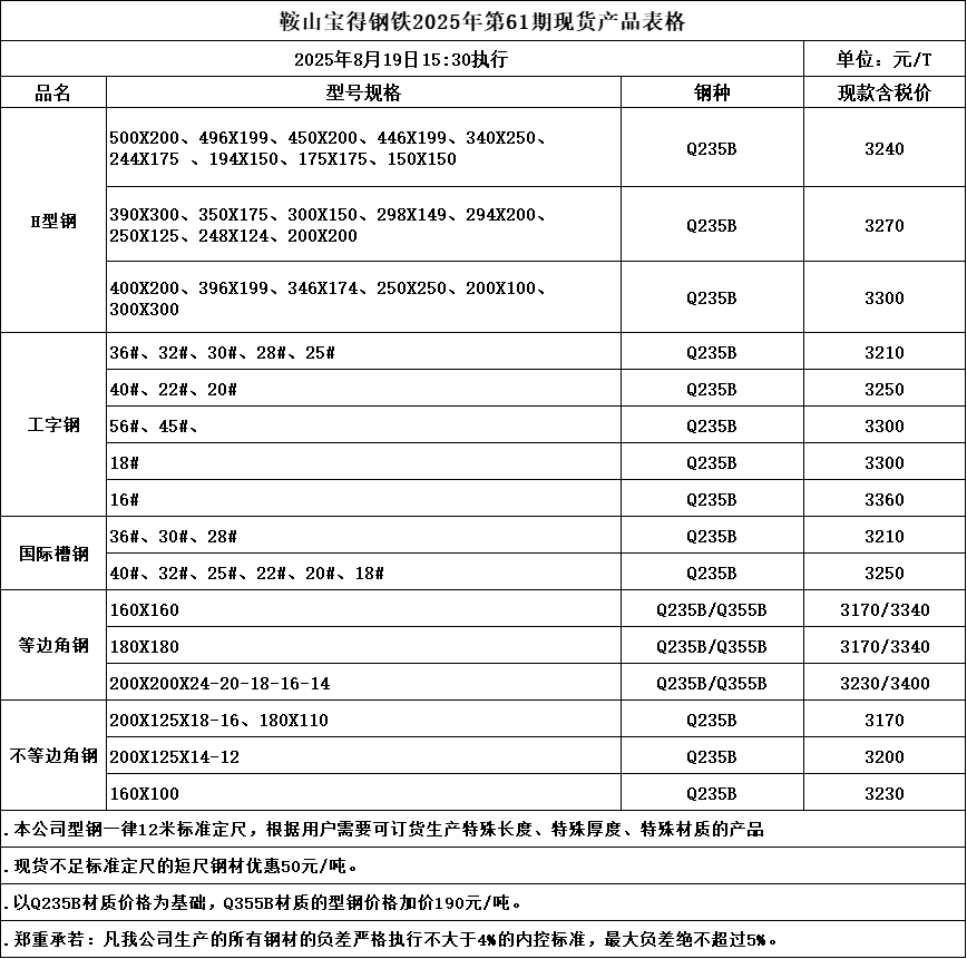 • 鞍山宝得钢铁2025年第61期现货产品表格