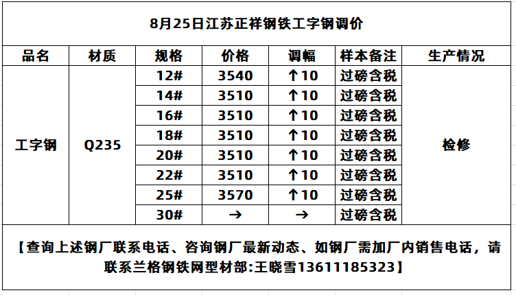 8月25日江苏正祥工字钢挂牌价较上周五涨10元