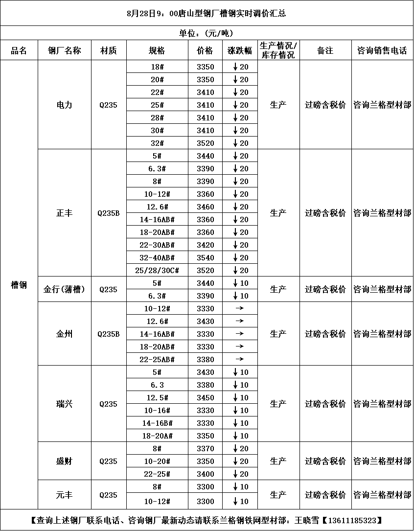 • 8月28日唐山元丰钢厂槽钢调价信息