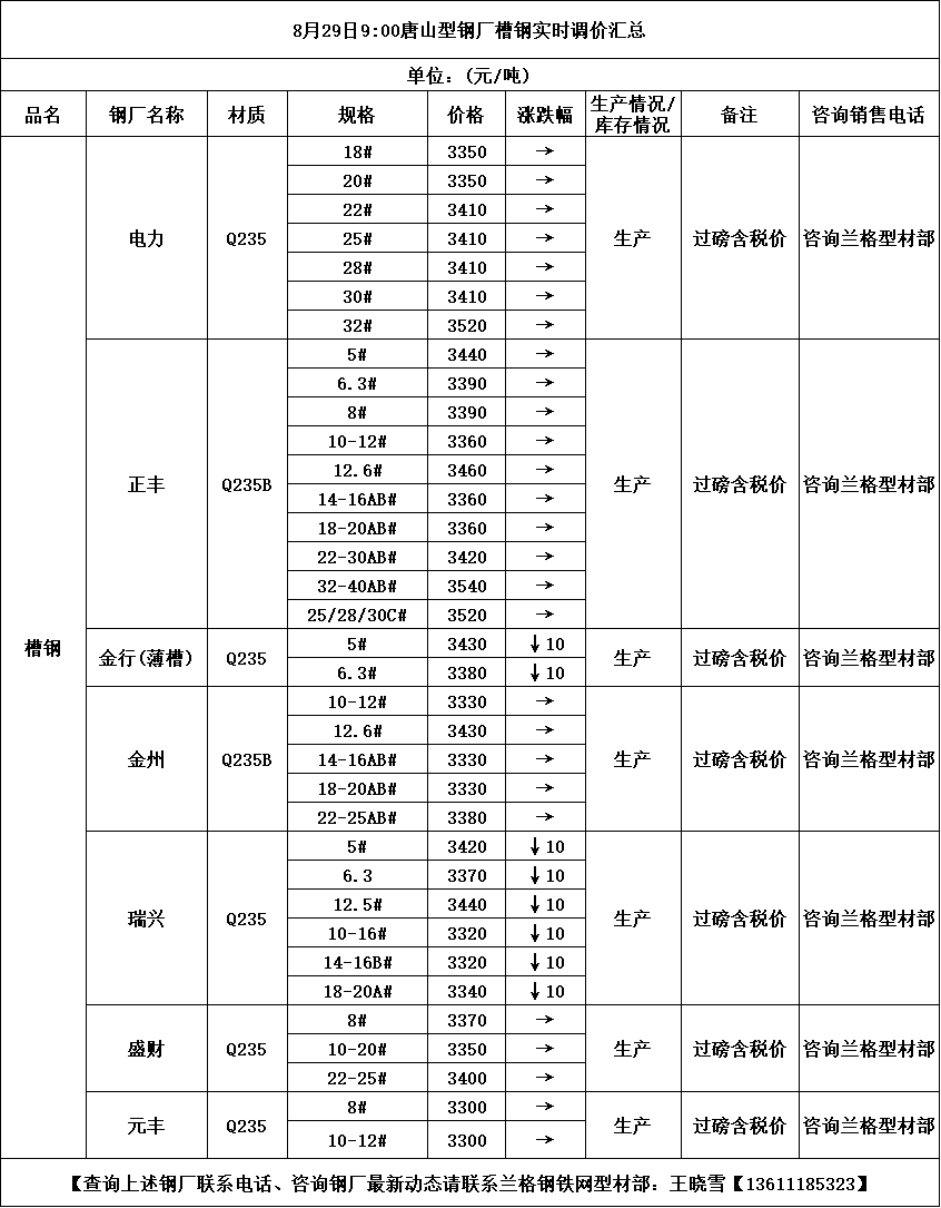 • 8月29日唐山元丰钢厂槽钢调价信息