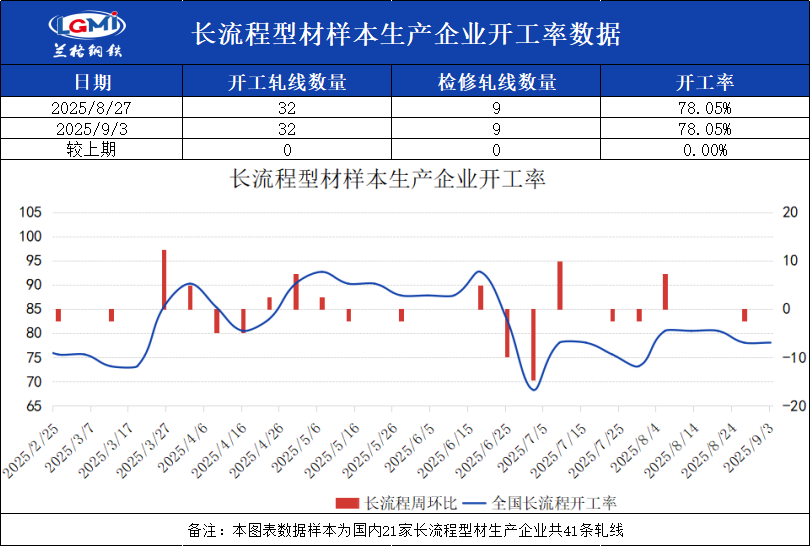 截至9月3日16:00,兰格钢铁网统计国内21家长流程样本生产企业共41条型钢轧线,在产32条,停产9条,开工率为78.1%,较上周维持不变。