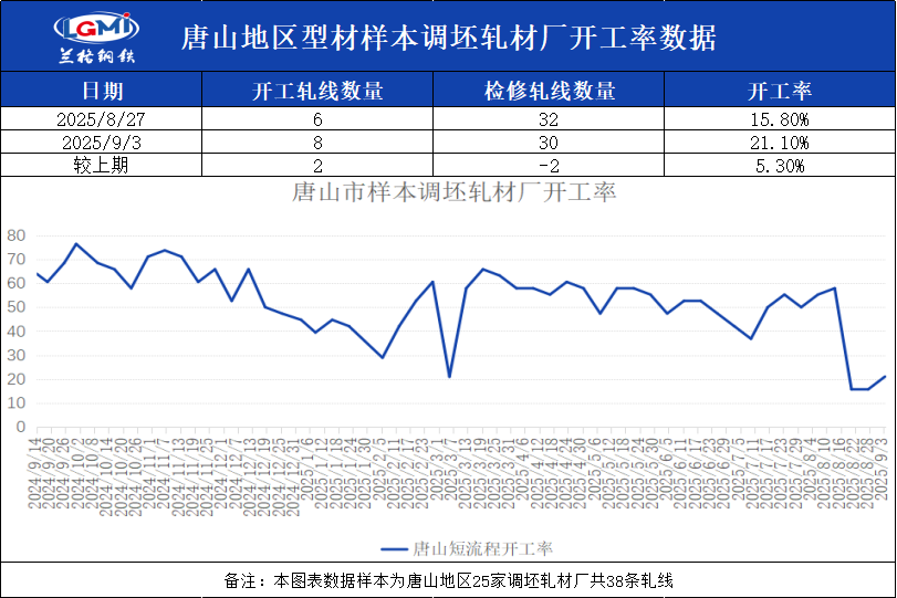 兰格钢铁网统计唐山24家样本轧钢企业共38条轧线,在产8条,停产30条,停产轧线数较上周减少2条,开工率为21.1%,较上周上升5.3%。