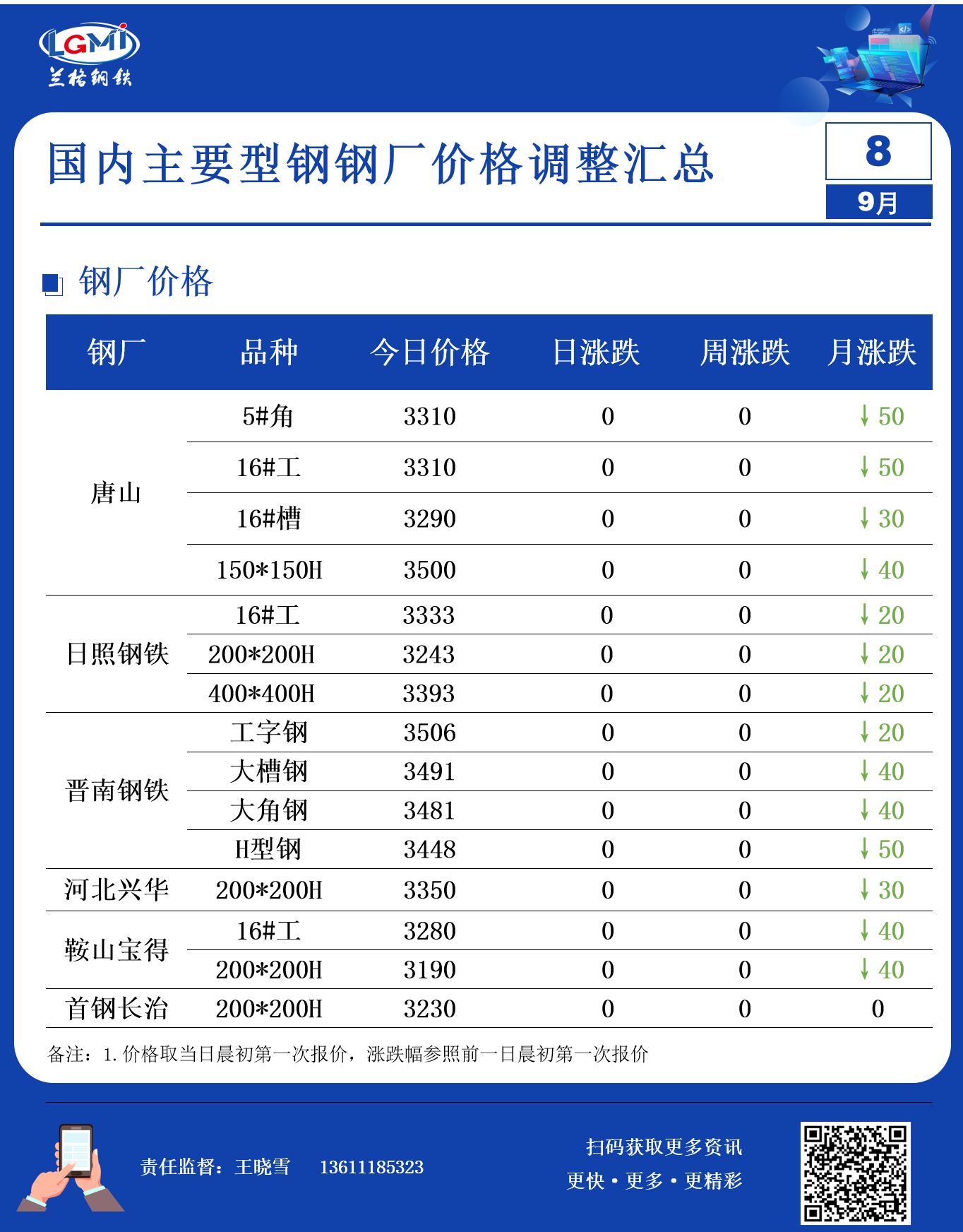 • 9月8日9:00唐山型钢厂角钢实时调价汇总