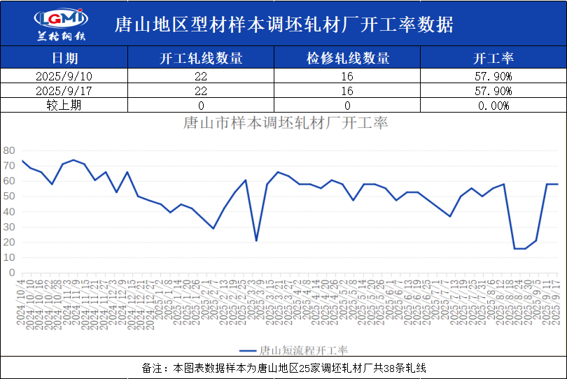 兰格钢铁网统计唐山24家样本轧钢企业共38条轧线,在产22条,停产16条,停产轧线数较上周不变,开工率为57.9%,较上周持平。
