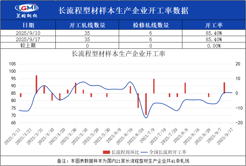 截至9月17日16:00,兰格钢铁网统计国内21家长流程样本生产企业共41条型钢轧线,在产35条,停产6条,开工率为85.4%,较上周持平。
