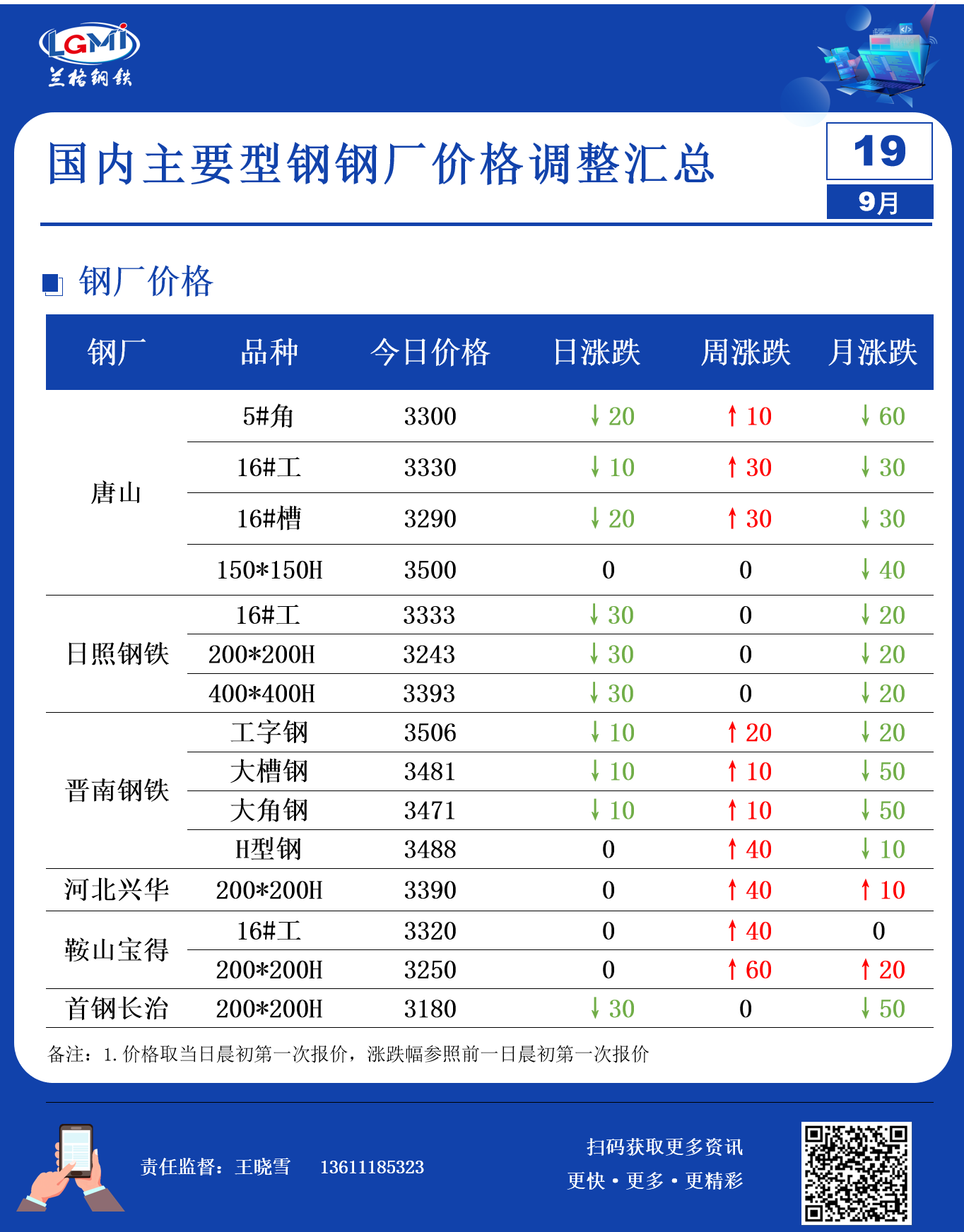 • 9月19日9:00唐山型钢厂角钢实时调价汇总