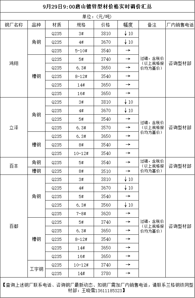 • 9月28日9:00唐山型钢厂角钢实时调价汇总