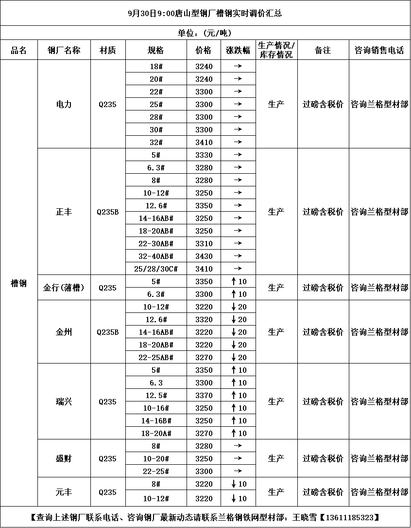 • 9月30日9:00唐山型钢厂槽钢实时调价汇总