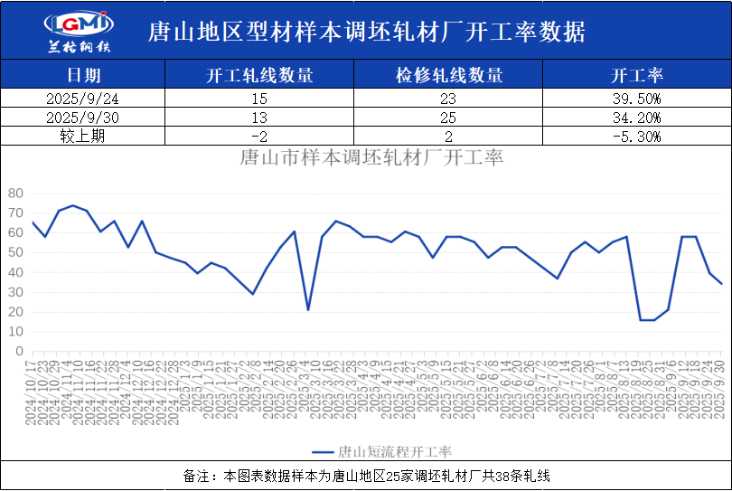 兰格钢铁网统计唐山24家样本轧钢企业共38条轧线,在产13条,停产25条,停产轧线数较上周增加2条,开工率为34.2%,较上周下降5.3%。