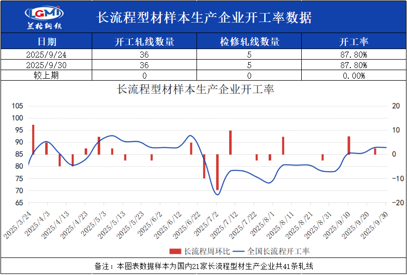截至9月30日16:00,兰格钢铁网统计国内21家长流程样本生产企业共41条型钢轧线,在产36条,停产5条,开工率为87.8%,较上周不变。