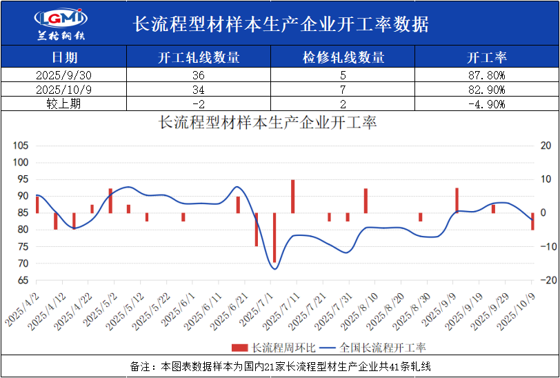 截至10月9日16:00,兰格钢铁网统计国内21家长流程样本生产企业共41条型钢轧线,在产34条,停产7条,开工率为82.9%,较上周下降4.9%。