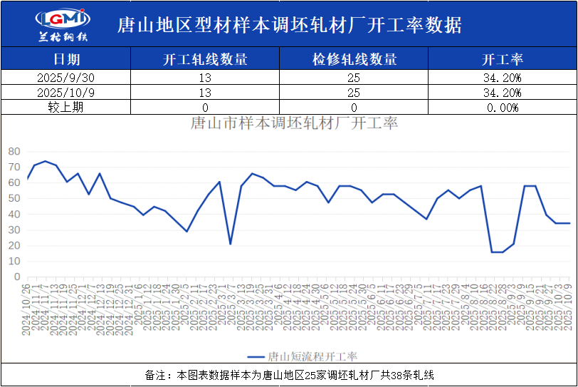 兰格钢铁网统计唐山24家样本轧钢企业共38条轧线,在产13条,停产25条,停产轧线数较上周不变,开工率为34.2%,较上周不变。