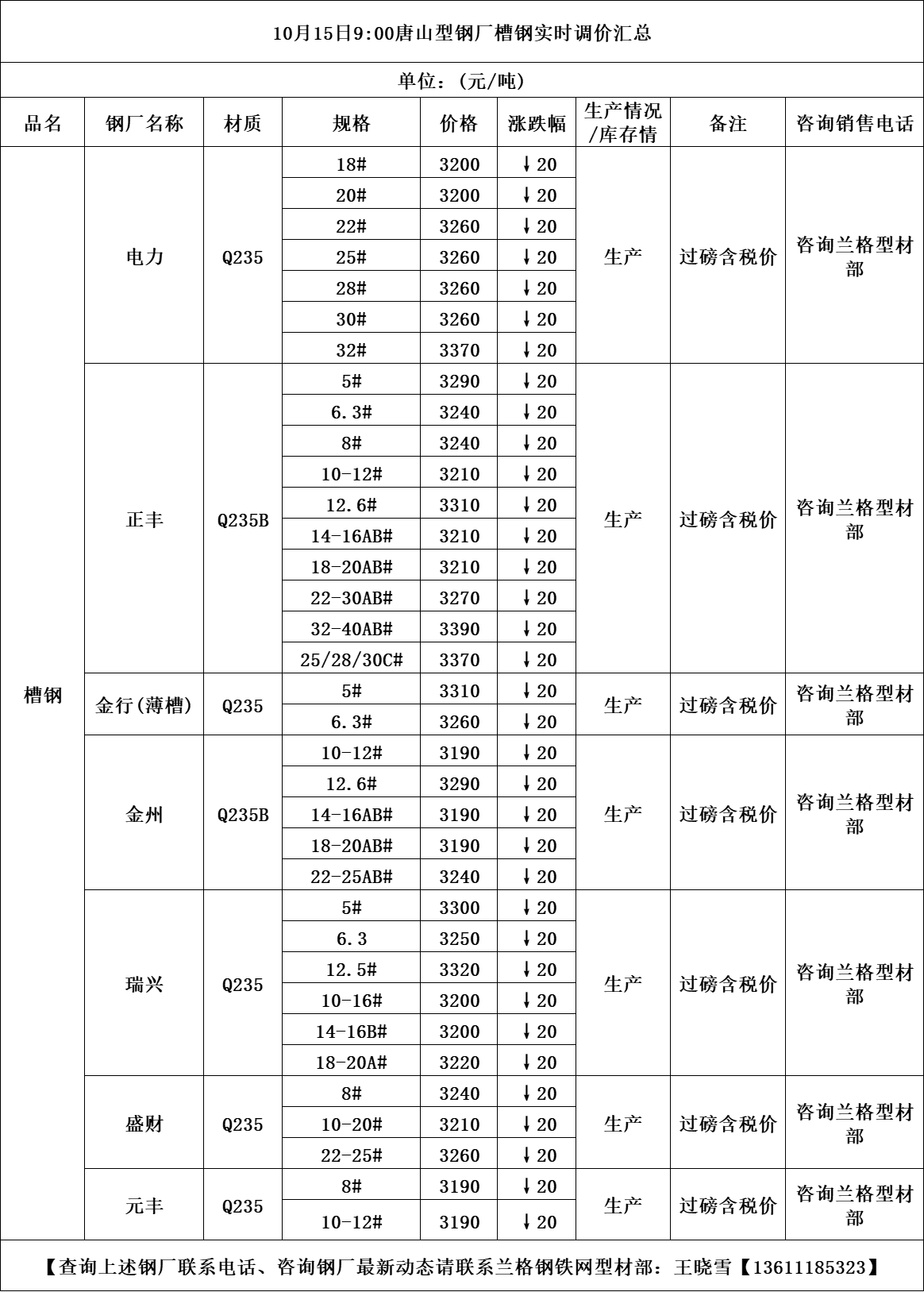 • 10月15日9:00唐山型钢厂槽钢实时调价汇总