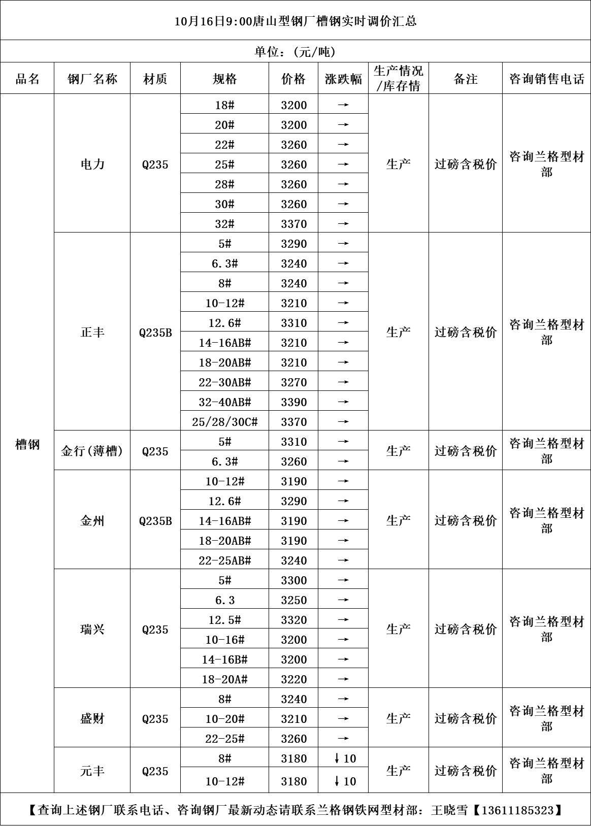 • 10月16日唐山元丰钢厂槽钢调价信息
