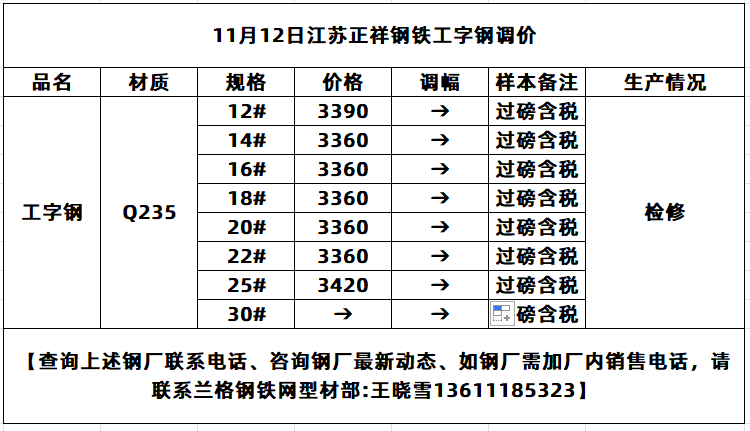 • 11月12日江苏正祥工字钢挂牌价维稳