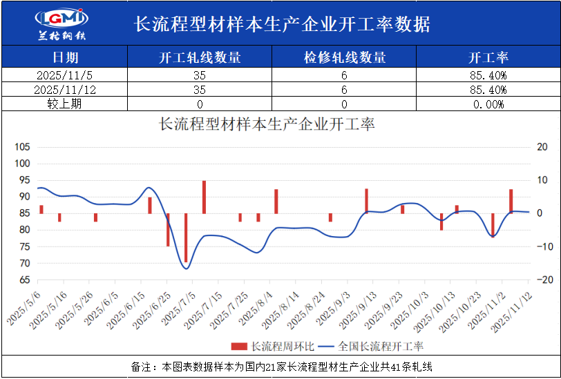 截至11月12日16:00,兰格钢铁网统计国内21家长流程样本生产企业共41条型钢轧线,在产35条,停产6条,开工率为85.4%,较上周不变。