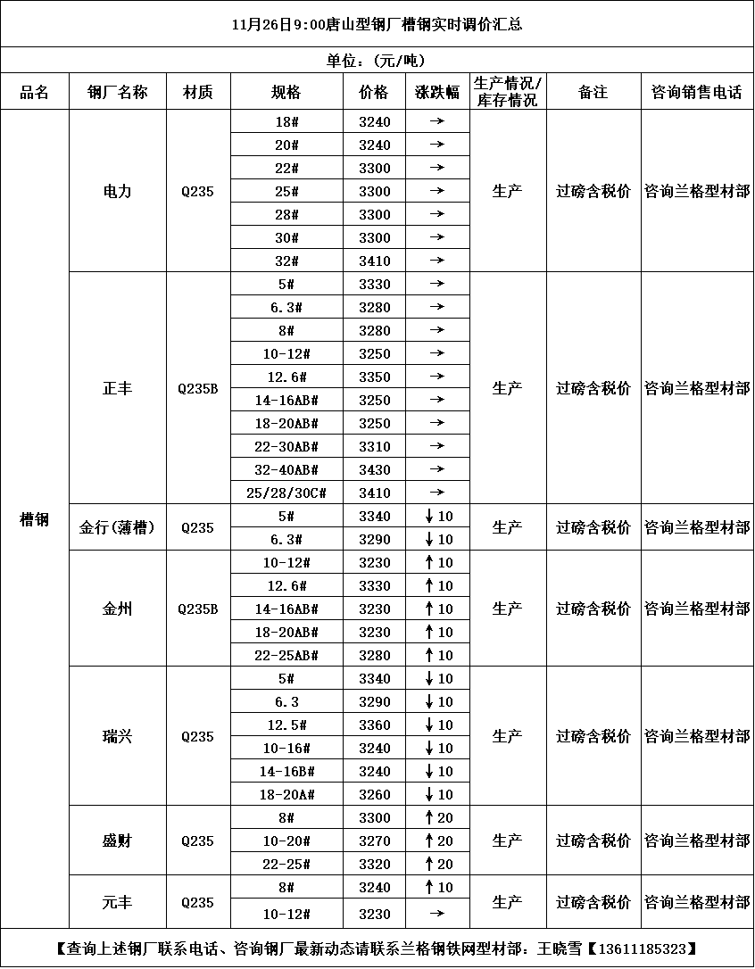 • 11月26日9:00唐山型钢厂槽钢实时调价汇总