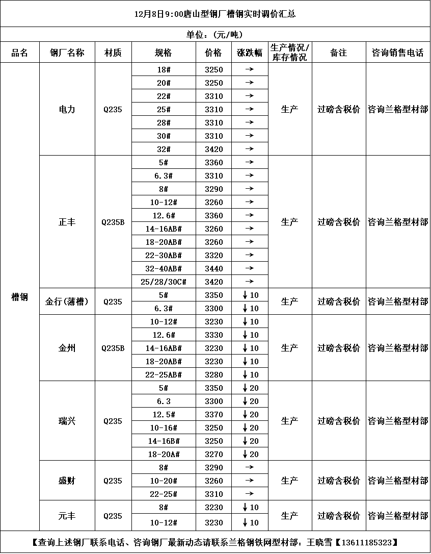 • 12月8日唐山元丰钢厂槽钢调价信息