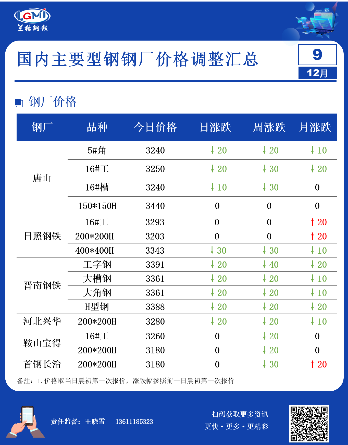 • 12月9日9:00唐山型钢厂槽钢实时调价汇总