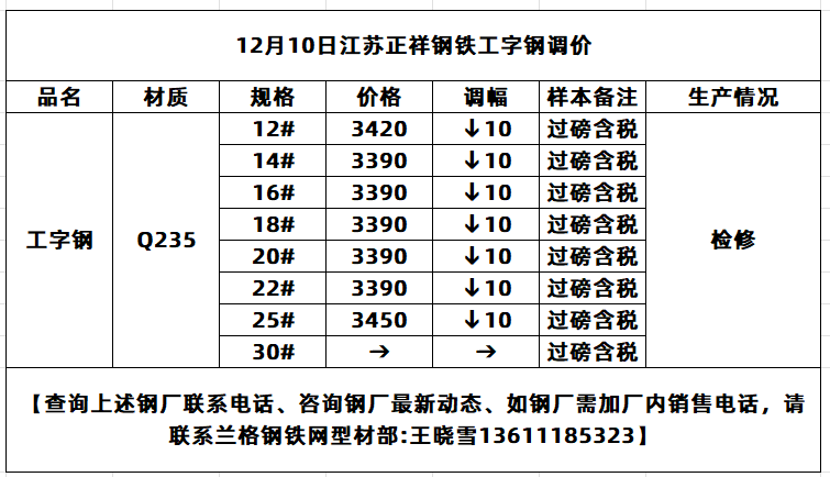 • 12月10日江苏正祥工字钢挂牌价下调10元