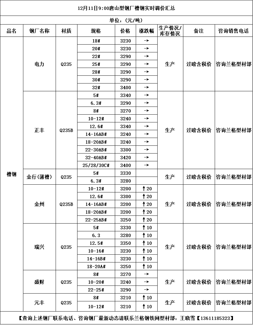 • 12月11日唐山元丰钢厂槽钢调价信息