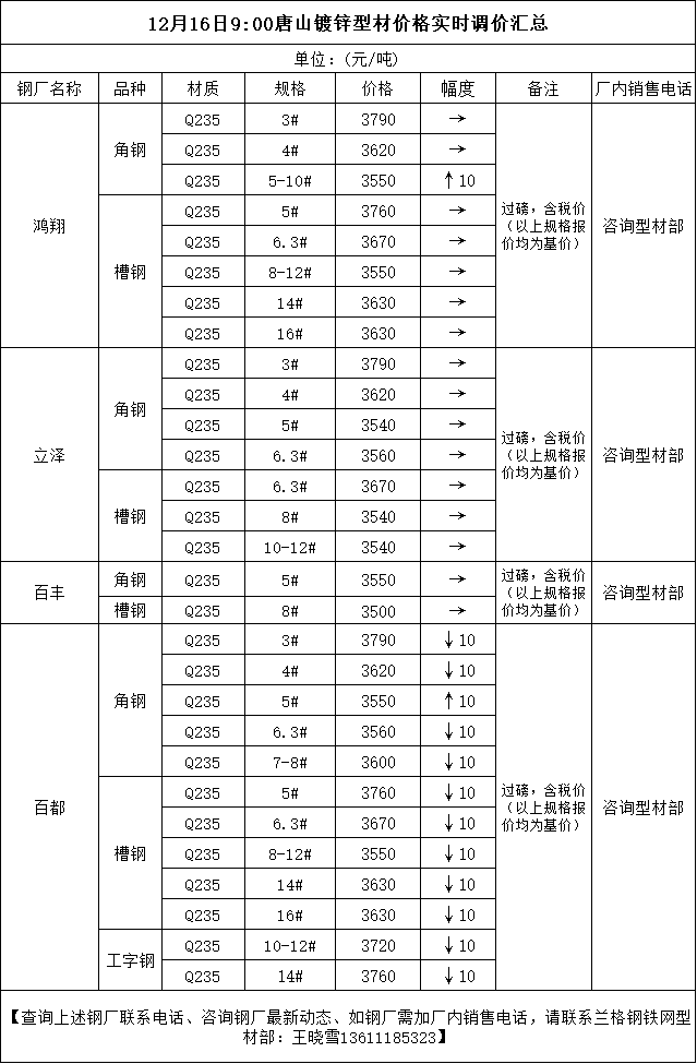 • 12月16日(9:00)唐山镀锌型材价格实时调价汇总