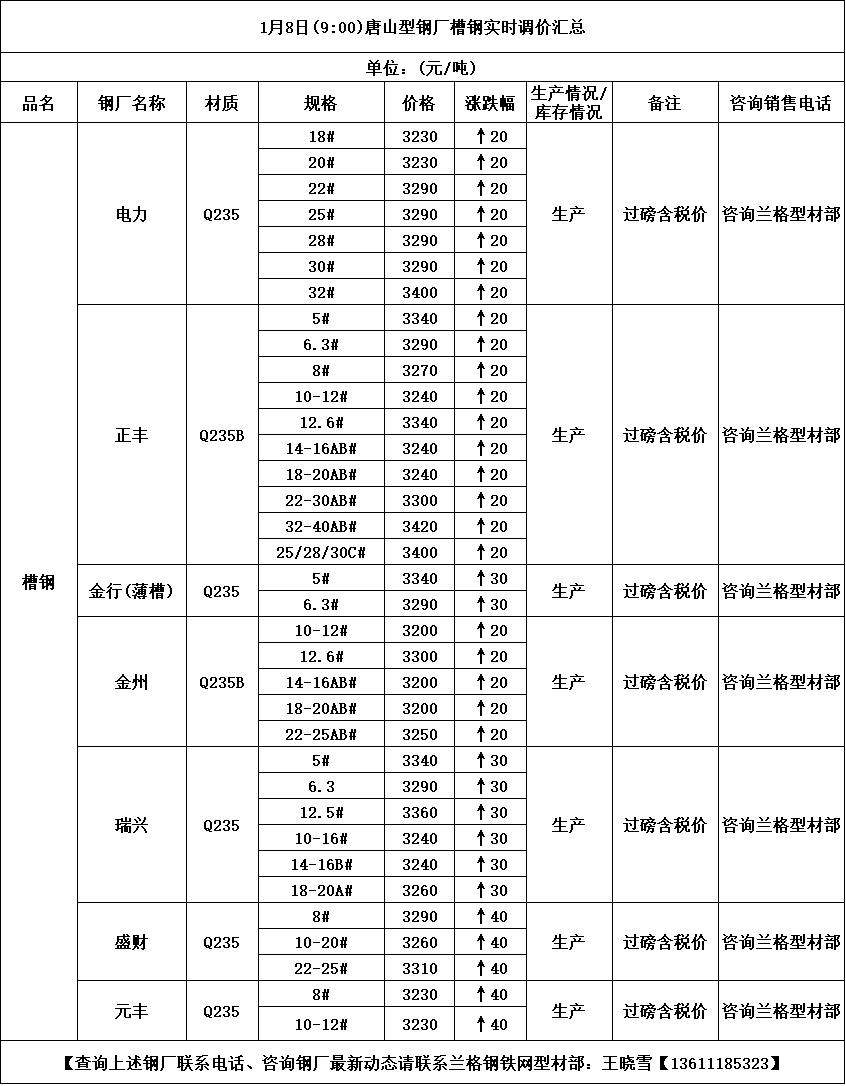 1月8日(9:00)唐山型钢厂槽钢实时调价汇总