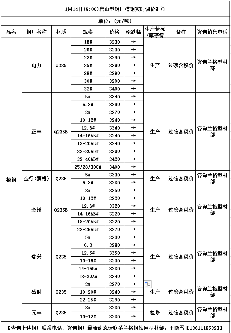 • 1月14日(9:00)唐山型钢厂槽钢实时调价汇总