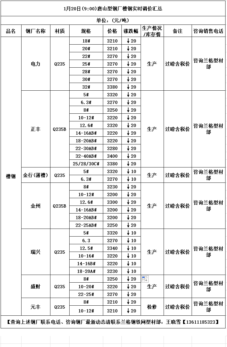 • 1月20日(9:00)唐山型钢厂槽钢实时调价汇总