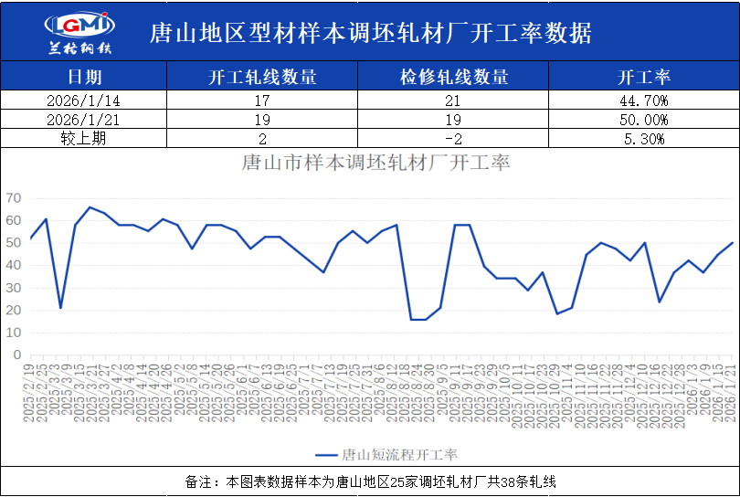 兰格钢铁网统计唐山24家样本轧钢企业共38条轧线,在产19条,停产19条,停产轧线数较上周减少2条,开工率为50%,较上周上升5.3%。
