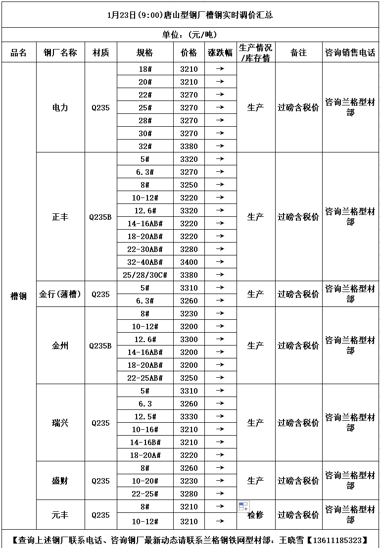 • 1月23日(9:00)唐山型钢厂槽钢实时调价汇总