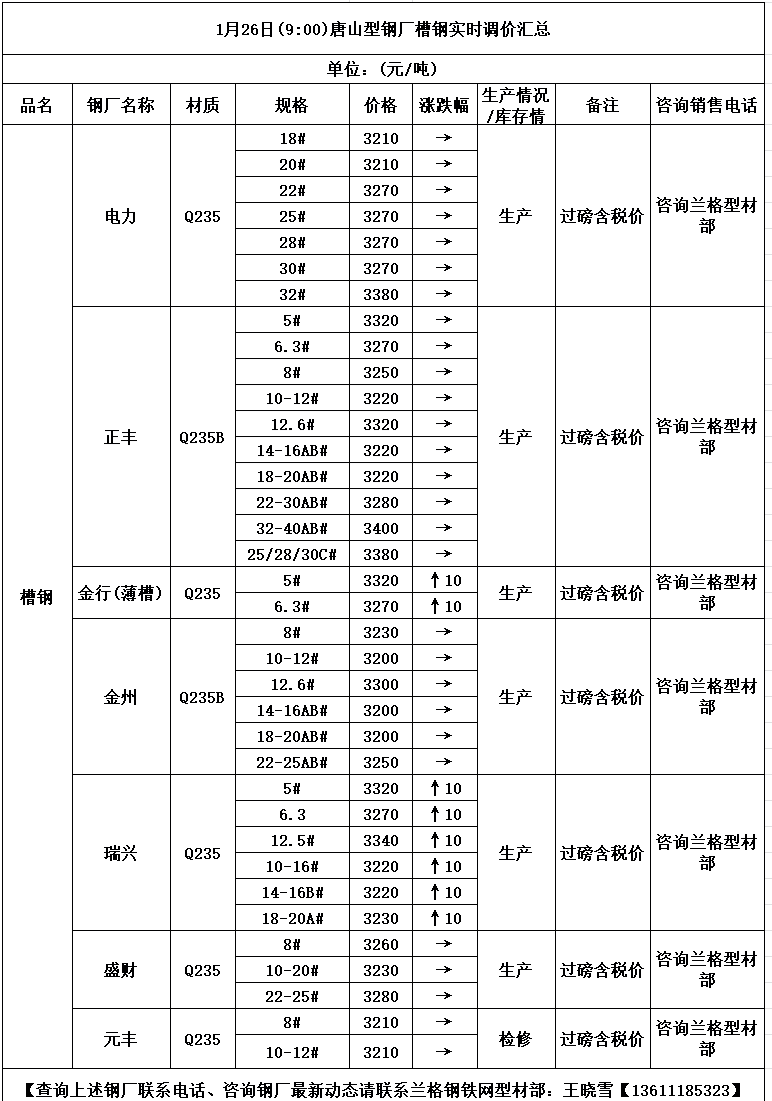 • 1月26日(9:00)唐山型钢厂槽钢实时调价汇总