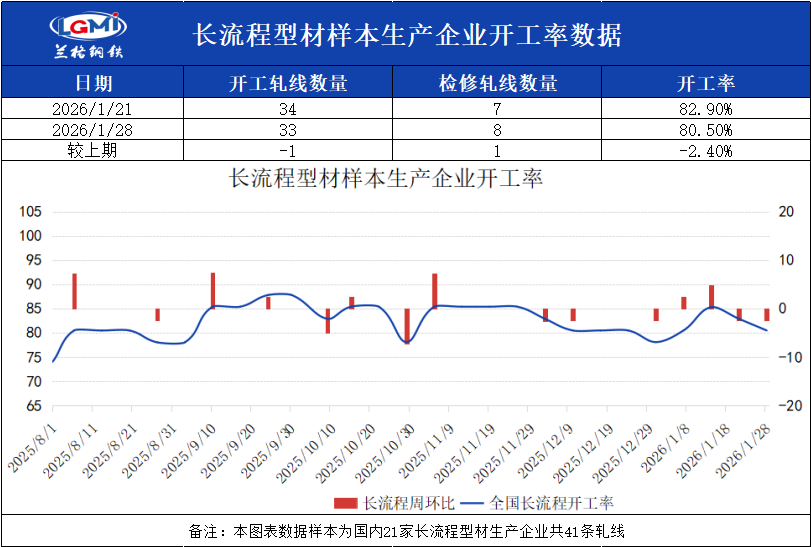 截至1月28日16:00,兰格钢铁网统计国内21家长流程样本生产企业共41条型钢轧线,在产33条,停产8条,开工率为80.5%,较上周下降2.4%。