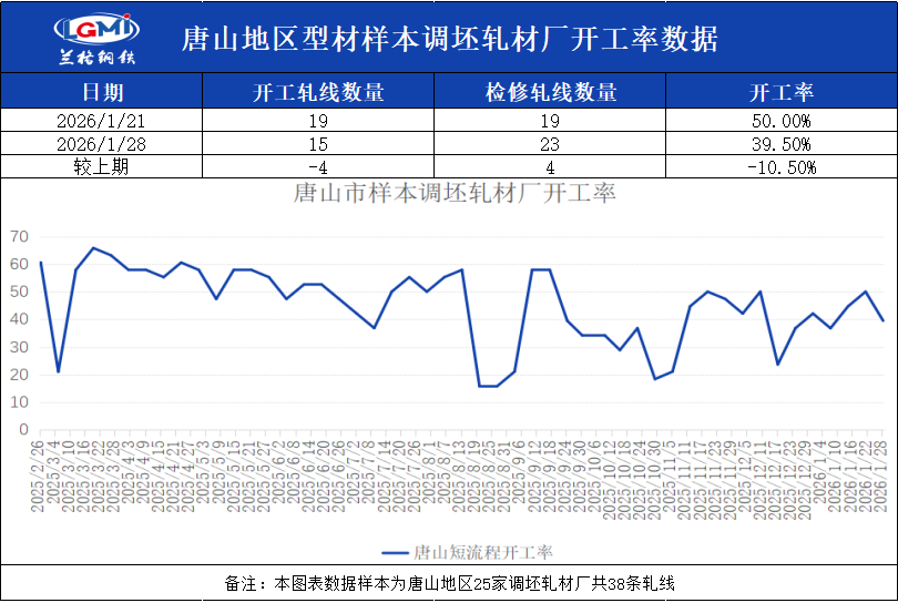 兰格钢铁网统计唐山24家样本轧钢企业共38条轧线,在产15条,停产23条,停产轧线数较上周增加4条,开工率为39.5%,较上周下降10.5%。