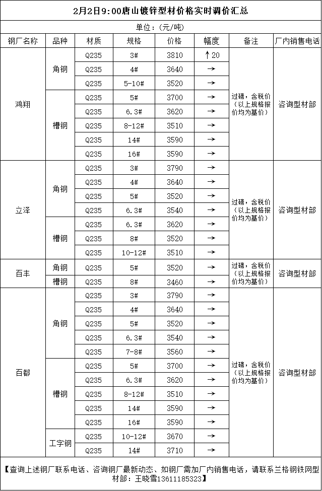 • 2月2日(9:00)唐山型钢厂角钢实时调价汇总