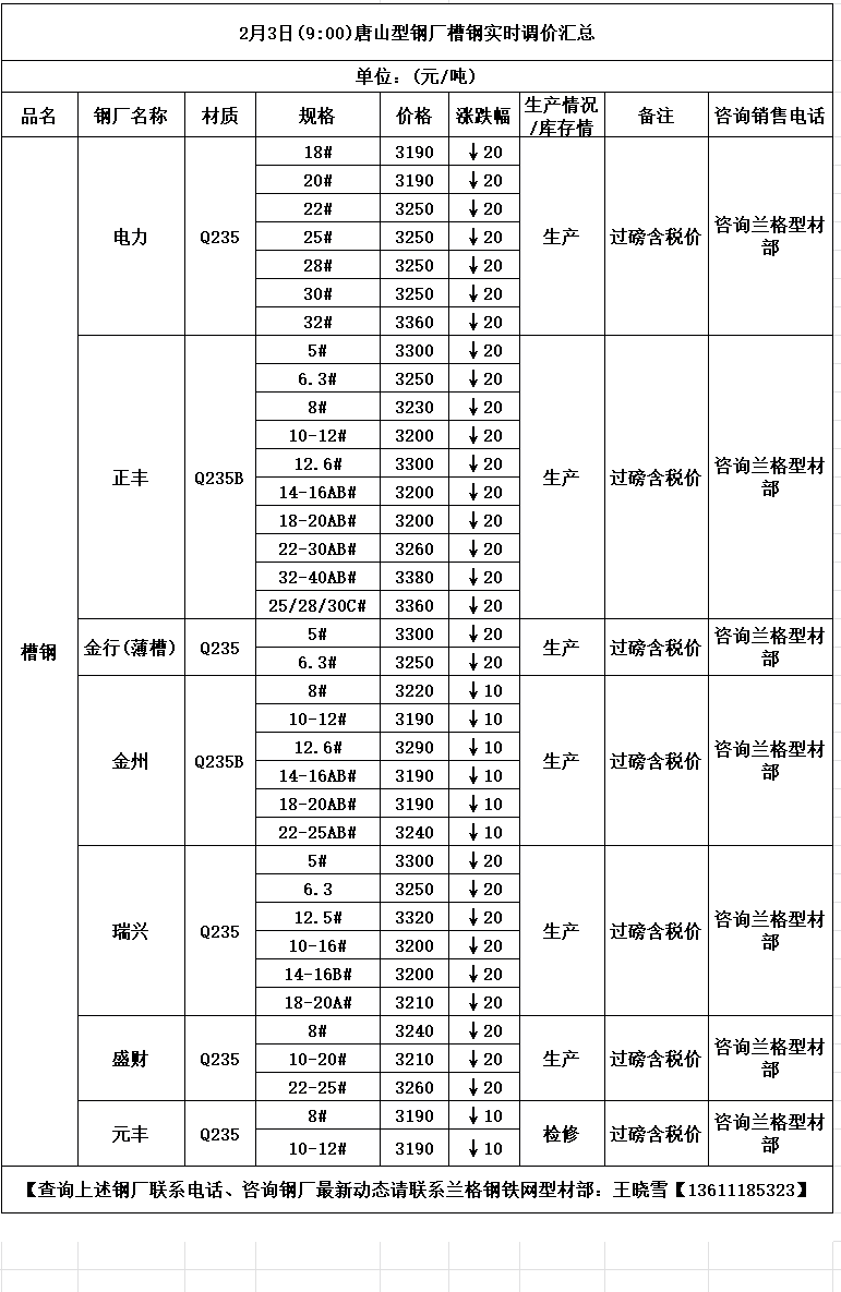 • 2月3日(9:00)唐山型钢厂槽钢实时调价汇总