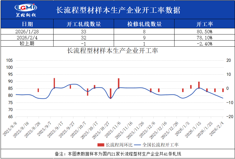 截至2月4日16:00,兰格钢铁网统计国内21家长流程样本生产企业共41条型钢轧线,在产32条,停产9条,开工率为78.1%,较上周下降2.4%。