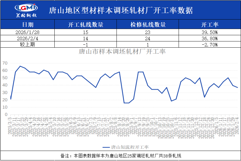 兰格钢铁网统计唐山24家样本轧钢企业共38条轧线,在产14条,停产24条,停产轧线数较上周增加1条,开工率为36.8%,较上周下降2.7%。