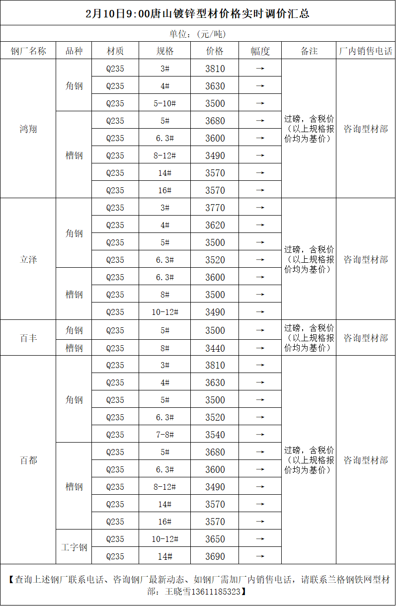 • 2月10日(9:00)唐山镀锌型材价格实时调价汇总