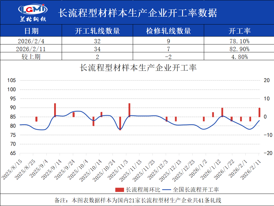 截至2月11日16:00,兰格钢铁网统计国内21家长流程样本生产企业共41条型钢轧线,在产34条,停产7条,开工率为82.9%,较上周上升4.8%。