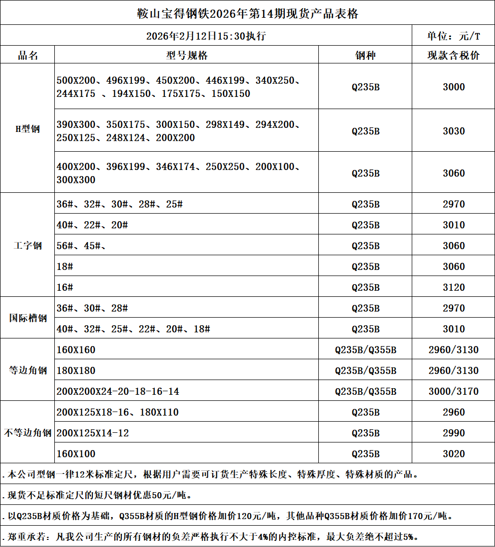 • 鞍山宝得钢铁2026年第14期现货产品表格