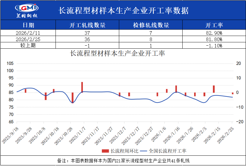 截至2月25日16:00,兰格钢铁网统计国内21家长流程样本生产企业共44条型钢轧线,在产36条,停产8条,开工率为81.8%,较上周下降1.1%。