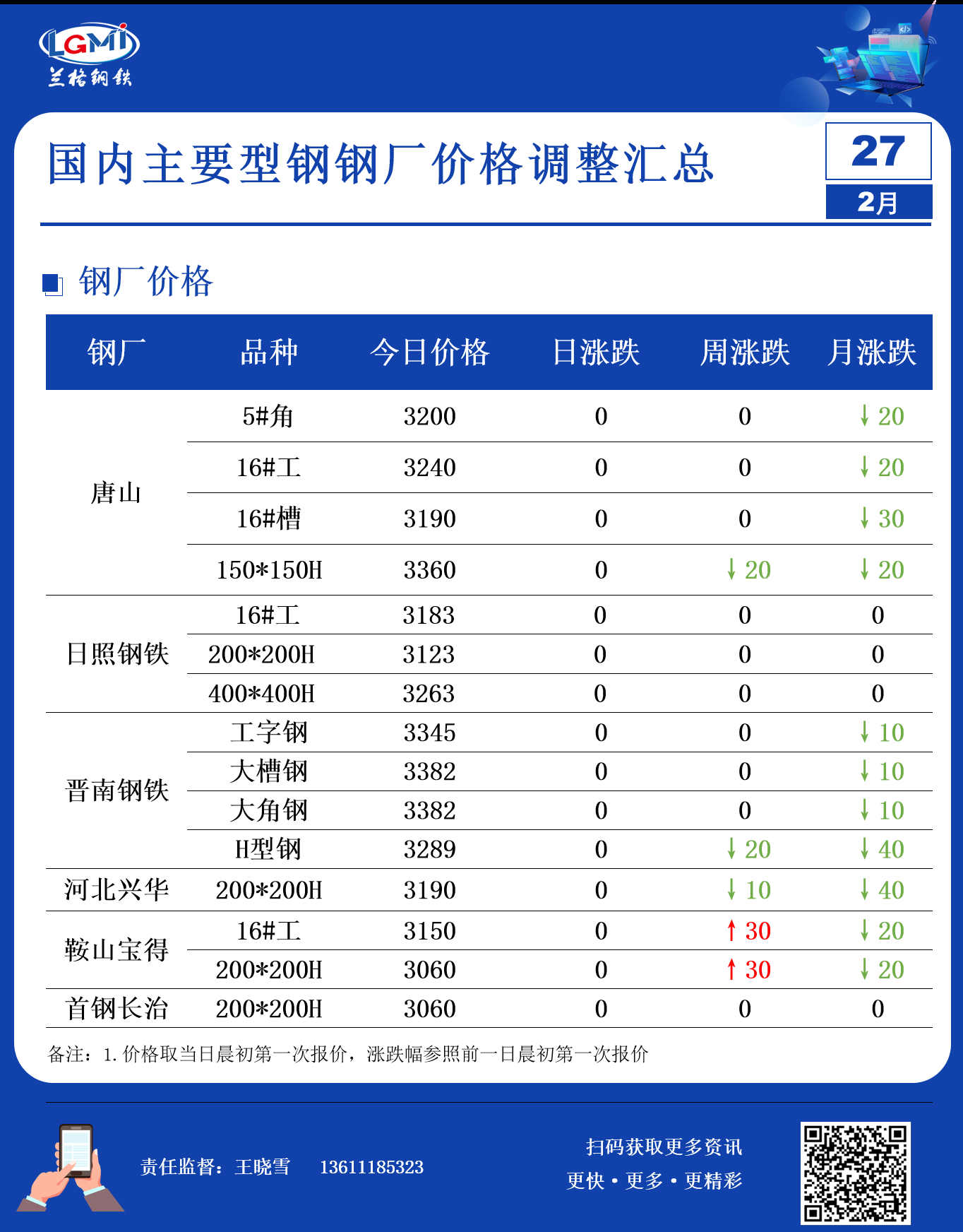 • 2月27日(9:00)唐山型钢厂槽钢实时调价汇总