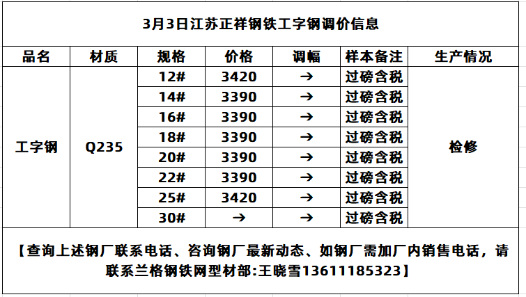 3月3日江苏正祥钢铁工字钢调价信息