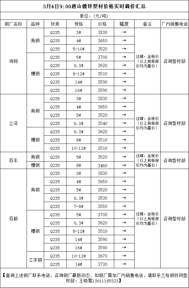 • 3月4日(9:00)唐山镀锌型材价格实时调价汇总