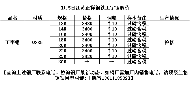 • 3月5日江苏正祥钢铁工字钢调价信息